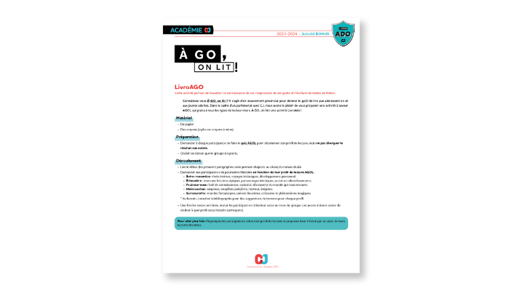 Dans le but de personnaliser votre expérience utilisateur, À GO, On Lit! utilise des témoins strictement nécessaires et des technologies similaires pour exploiter ce site. Voir les détails ici.
